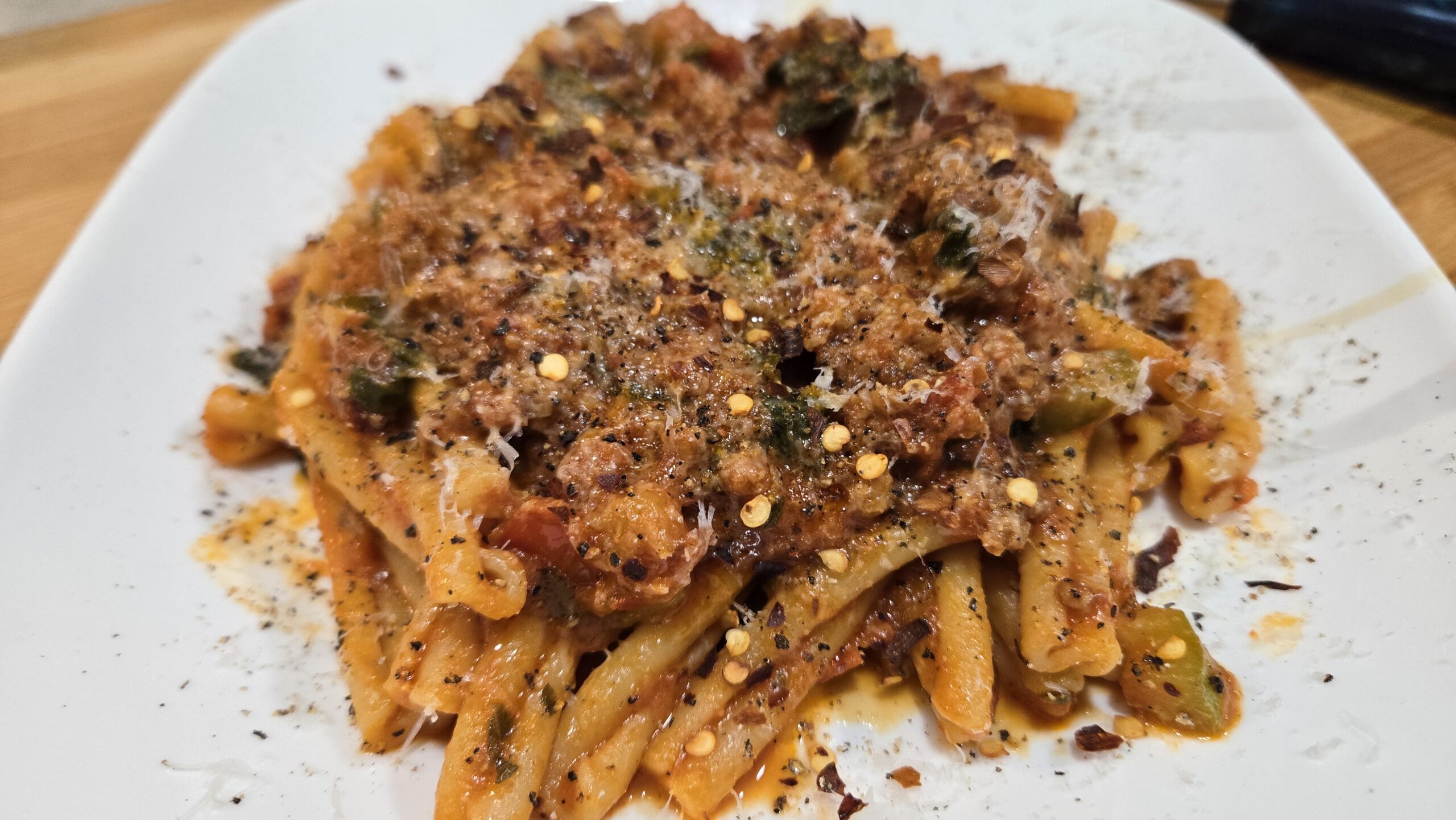 Gemelli Pasta with Sausage, Vodka Sauce, Zucchini & Spinach